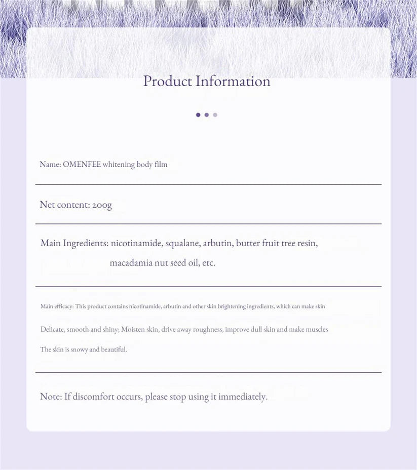 Reveal smoother, brighter-looking skin with **Omenfee Cold Body Whitening Cream**. This refreshing body cream is formulated to help improve the appearance of dull, uneven skin tone while keeping your skin soft, hydrated, and glowing.